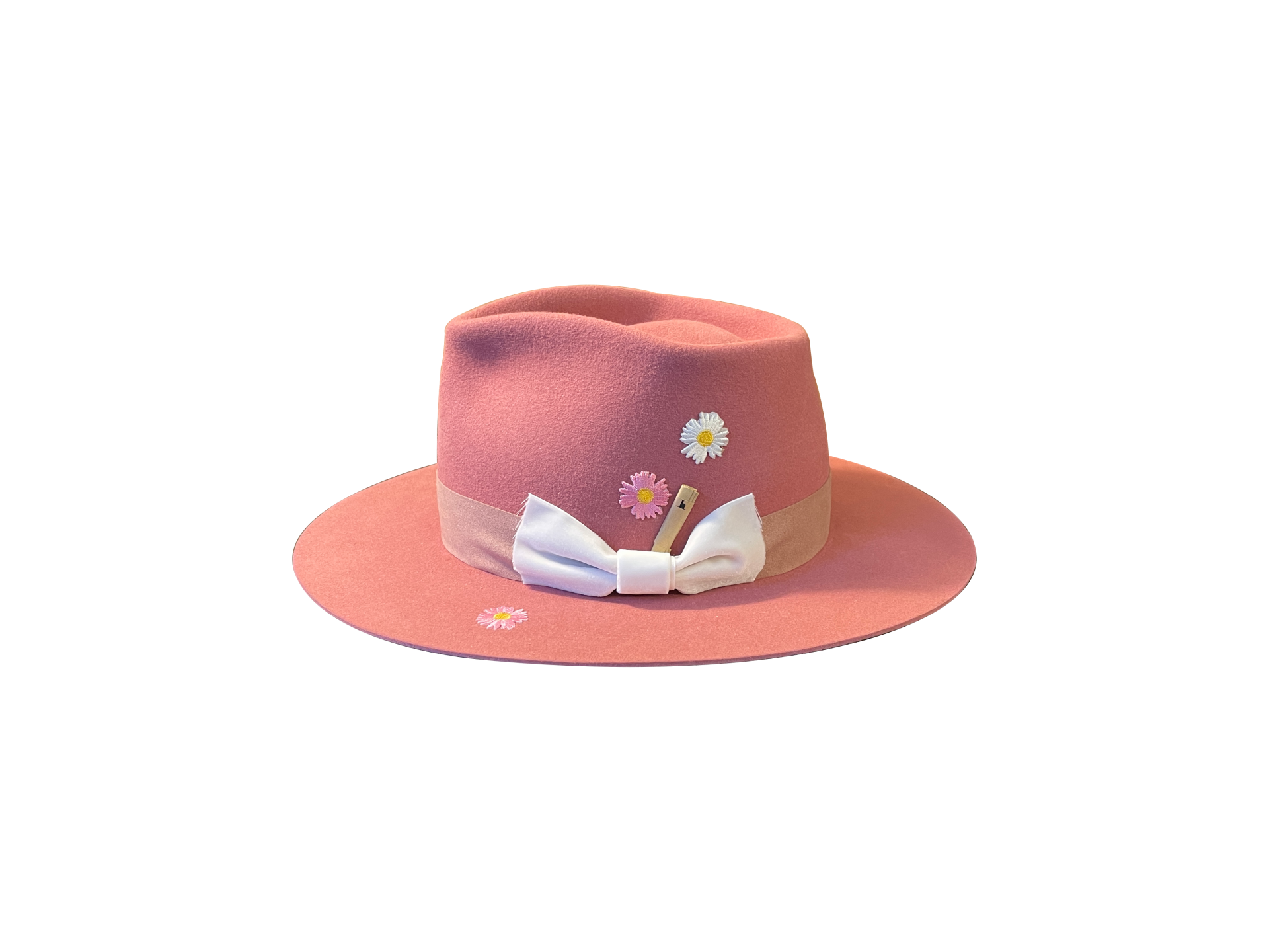 모자 한쪽에 리본 및 디테일과 함께 말아서 꽂은 브랜드 시그니처가 빈티지한 감성을 더해줍니다.