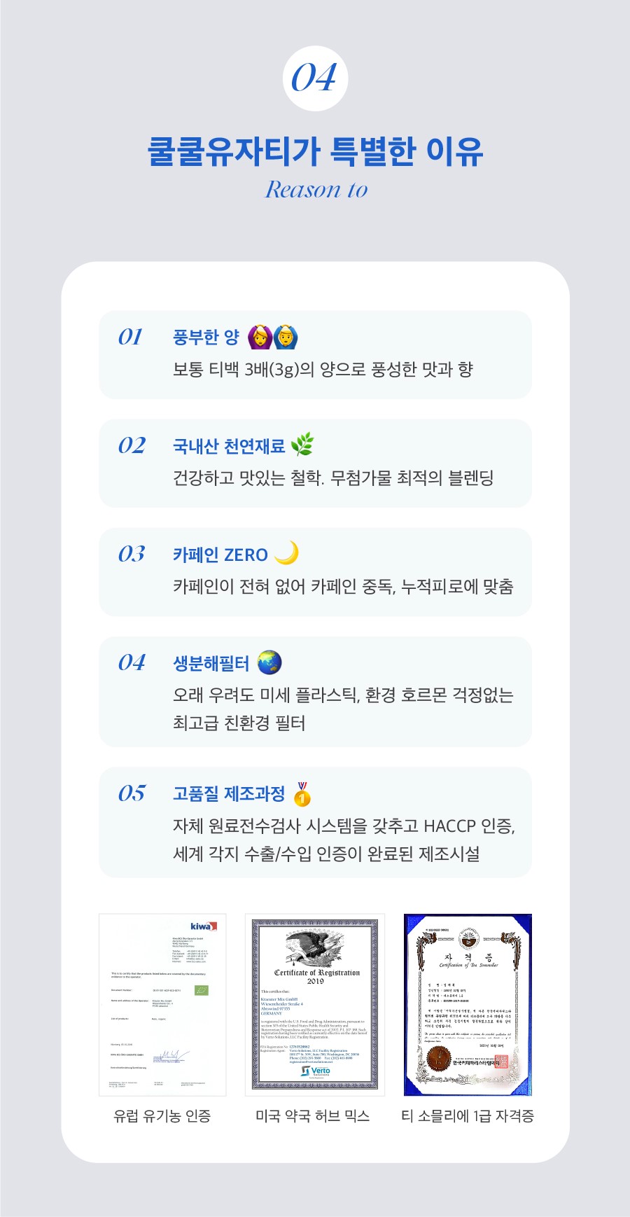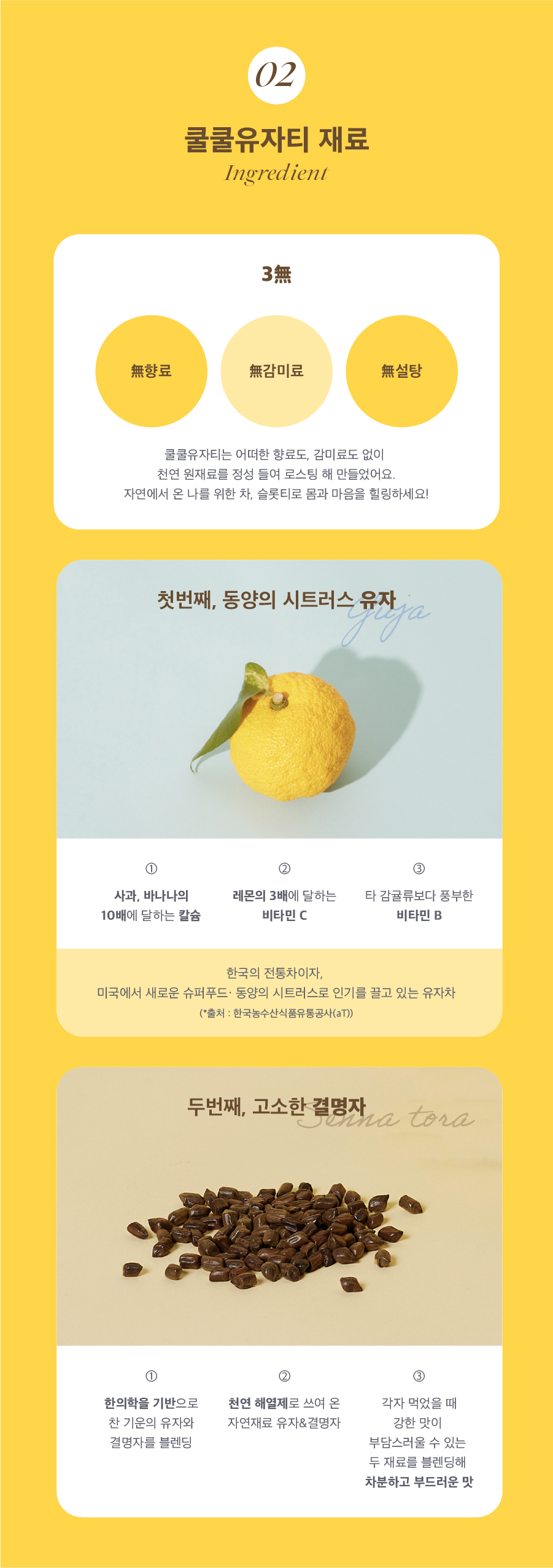 어떠한 향료도, 감미료도, 설탕도 없는 쿨쿨 유자티는 천연 원재료를 정성들여 로스팅해 만들었어요!