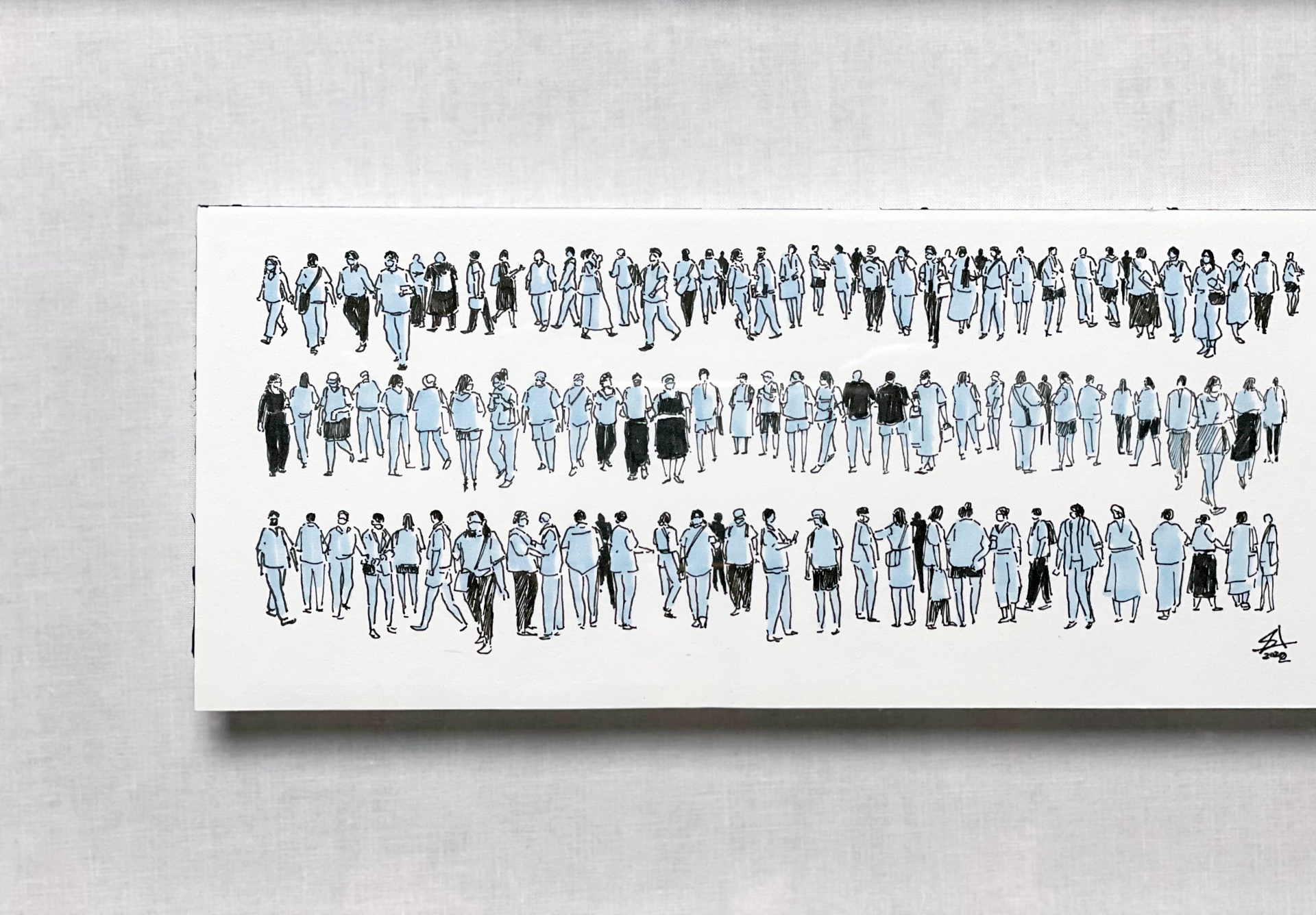 아침에 종이를 들고 카페에 앉아서 지나다니는 사람들을 그려간다. 아침의 차가운 빛이 사람들을 감싸고 있다.