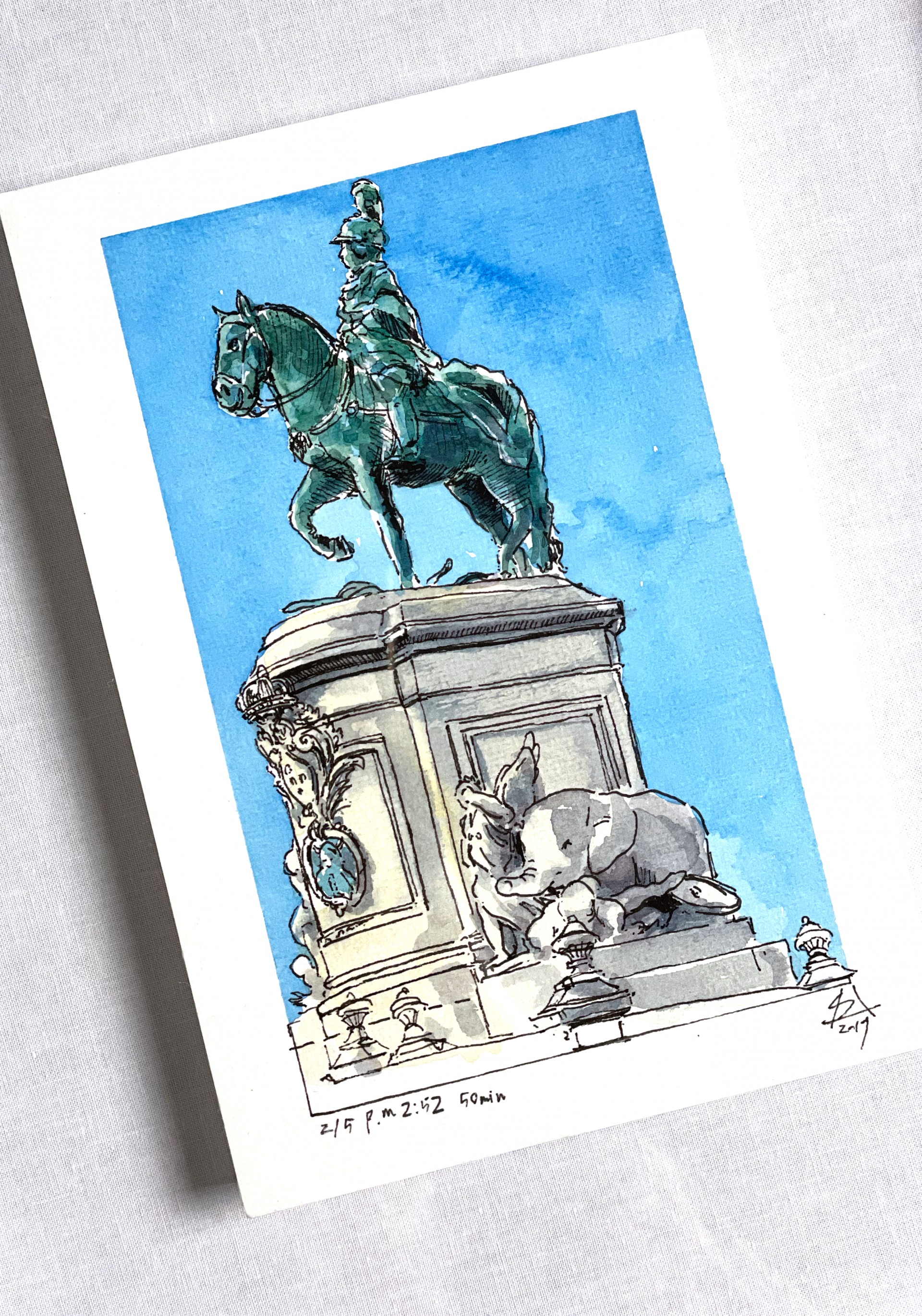 광장의 가운데에 있는 동상이다. 어떠한 동상인지는 모르지만 파란 하늘과 대조적으로 있는 모습이 아름답다.